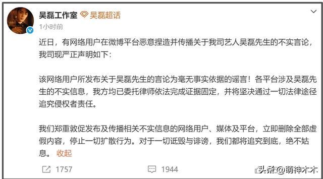 很快,吴磊工作室发文辟谣,表示有网络用户恶意捏造并传播关于吴磊的不实言论,他们会通过一切法律途径追究侵权者责任,接着就是熟悉的警告网友环节,吴磊工作室要求网络用户、媒体和平台立即删除全部虚假内容,停止一切扩散行为。