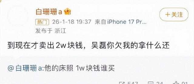吴磊事件升级牵出多位明星! 胡歌花心 何猷君出轨、和嫩模绯闻的他 2026紫微星再不出来,内娱真的是要被搞没了吴磊“床照”牵扯出内娱半壁江山,内娱点名姐再添一人1月18日晚,一个叫“白珊珊a”的账号在微博丢下一句“床照1万”的引流口号,又点名吴磊,说自己只卖出2万、要他还钱, ... 明星秘密01-21