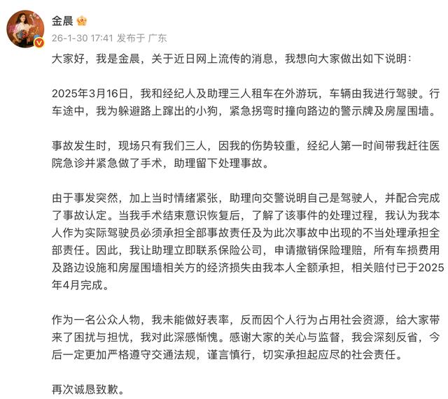 金晨致歉!绍兴警方通报女星车祸事件:驾驶员为金某,事后胡某青谎称系驾驶员“顶包” 1月30日,绍兴市公安局柯桥区分局发布警情通报:1月29日,我局关注到网传金某在绍兴柯桥涉嫌交通肇事"顶包"信息后,立即成立专班,开展事故情况复查、调查过程复核等工作。网络截图。现基本查明,2025年3月16日中午1 ... 明星秘密01-31