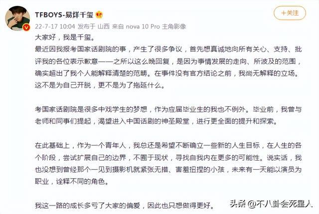 2022年的7月,热搜牢牢被易烊千玺“霸占”,不过却不是什么好事儿。当时因易烊千玺无笔试考进了国家话剧院引发争议,被大批网友质疑,昔日好口碑毁于一旦。