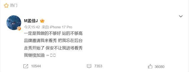 孟佳发文:一定是我做的不够好,站的不够高,品牌邀请我来看秀,把我忘在后台,走秀开始了 ,保安不让我进场看秀,我继续加油 ~