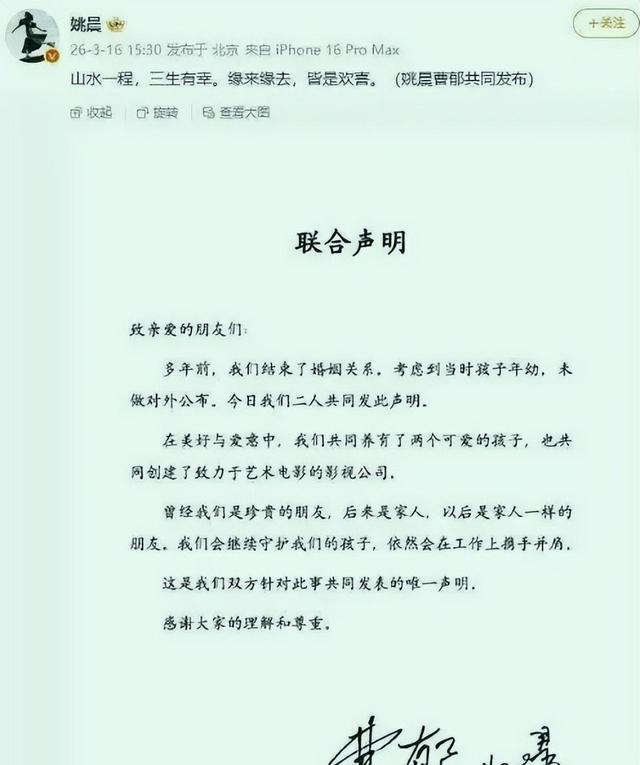 姚晨和曹郁在3月中旬共同发布声明,解释对孩子的考虑才隐瞒已离婚的事实。