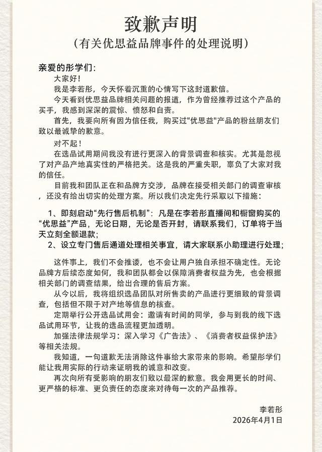 中国政法大学副教授朱巍指出,明星作为广告代言人,一旦产品被查实违法违规,就需根据不同情形承担对应法律责任,且责任不会因致歉声明而免除。