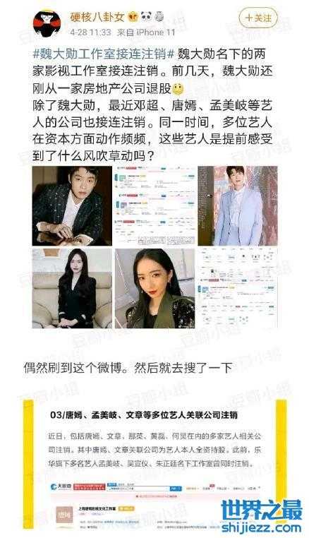 4月28日,有微博大V爆料,知名艺人魏大勋名下的两家影视工作室接连注销。除了魏大勋,邓超、唐嫣、孟美岐、那英、黄磊、何炅等艺人的工作室也注销。