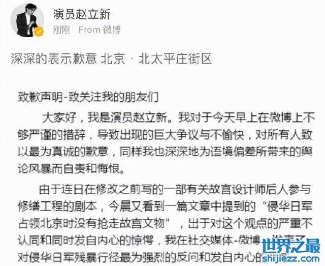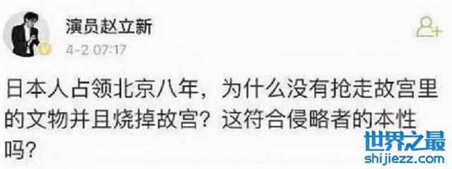 19年的4月2日,赵立新演员在微博上发文,“日本人占领北京八年,为什么没有抢走故宫里的文物并且烧掉故宫?这符合侵略者的本性吗?引发了一众网友怀疑,历史客观事实没有学好可以理解,为什么政治立场还是错误的呢?