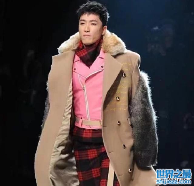 在T台上,刘翔外面穿着一件土黄色的大衣,领子有很多的毛,里面搭配了一件粉嫩的皮夹克。