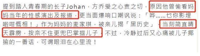当自己的儿子嘲讽的自己怎么会拍这种东西的时候,麦家琪简直又羞愧又气愤,一时间情绪复杂,直接给了儿子两个巴掌。事后她深深的自责自己过于冲动,并且向儿子解释了当年的心酸,并获得了儿子的理解。
