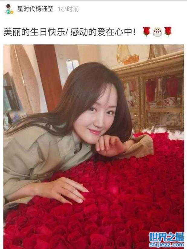 “美丽的生日快乐,感动的爱在心中”,照片中的杨钰莹趴在玫瑰花上,笑容非常的甜美,