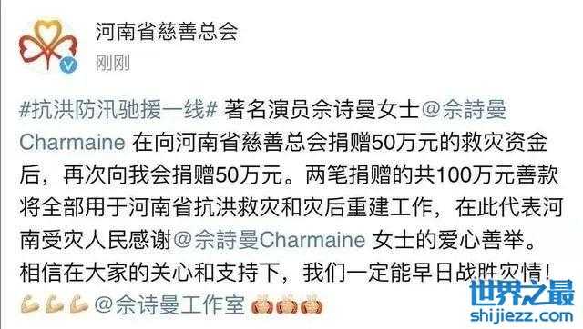 佘诗曼除了为国家队加油,还把自己的社交平台的认证信息从“香港演员佘诗曼”改成“中国香港演员佘诗曼”,她还曾经为河南捐款100万。