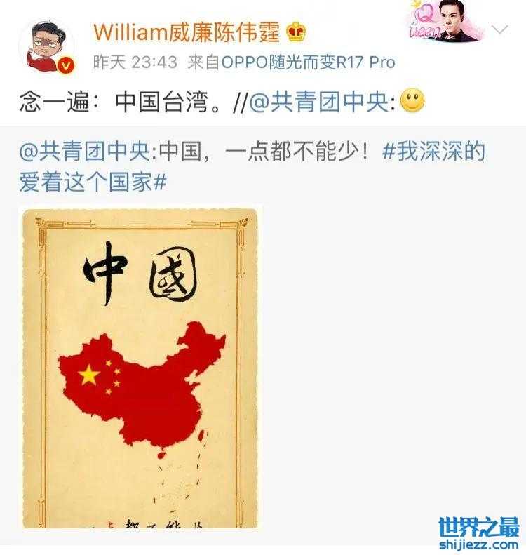 和佘诗曼一样,陈伟霆也在为河南捐了100万,另外他曾经在社交平台发言:念一遍,中国台湾。四个字足以表明爱国心。