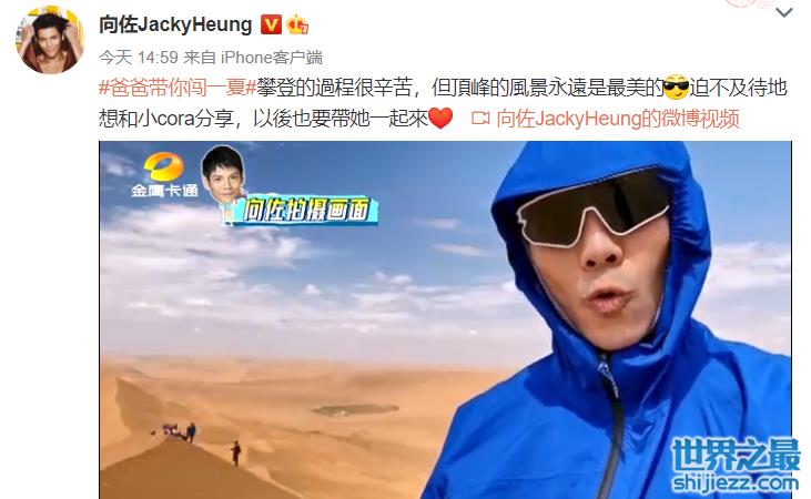 在视频中,向佐不忘用手机录制视频,正如向佐透露的那样,这则视频是他专门为女儿录制的,希望下一次能与女儿相伴再度登上所谓的“沙漠珠峰”,一起欣赏这里最美丽的风景,可见向佐着实是爱女心切,时刻将小cora放在心尖,还透露女儿好动,未来应该也是喜欢,相信向佐对于未来拥有很多规划,等到女儿慢慢长大后再逐一实现,这份父爱可谓是温情且厚重。