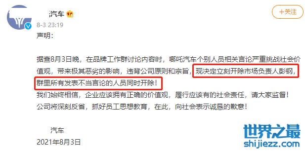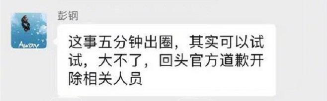 一群人在群里讨论得火热,他们的讨论这些消息时,是晚上九点多。没想到,到了晚上十一点多的时候,该品牌的官方,就发了一条声明称,决定开除在群里讨论吴亦凡的相关工作人员。那个提议的人叫彭钢,他首先就被开除了。