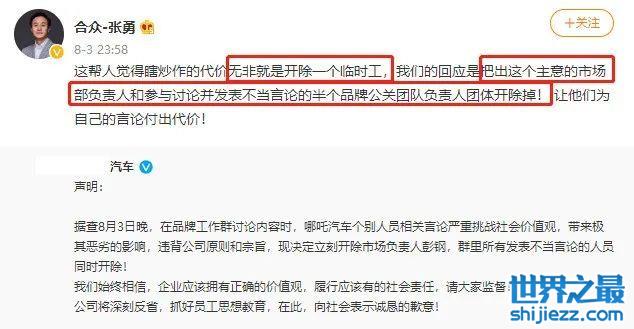 随后,该汽车品牌的首席执行官张勇也出来表示,彭钢的原意是想开除一个临时工,让临时工出来垫背。但他们却决定就开除这些出主意的负责人,好让他们为自己的言论付出代价。