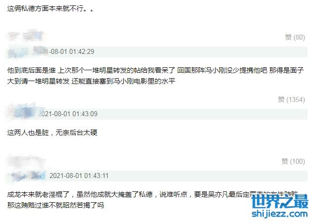 有网友觉得,吴亦凡的底气离不开这两位“大佬”的支持,有网友提到了成龙以前的私生活方面,觉得这两位“大佬”的私德方面也不行。