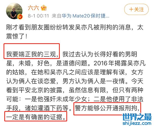 吴亦凡被拘留后,六六深夜发了长篇的道歉文,称要端正自己的三观,并且说自己很鄙视吴亦凡。