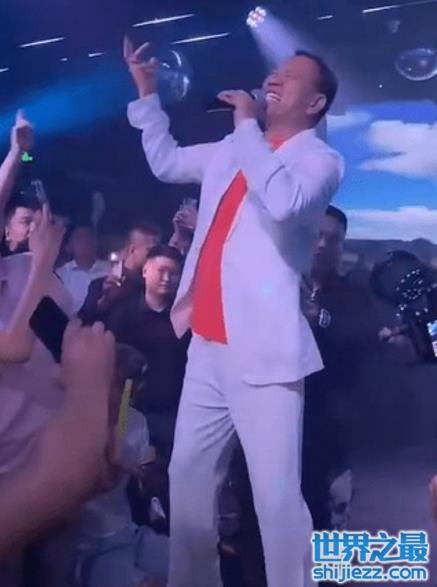 画面中,万梓良站在台上拿话筒唱歌,随后有一位长腿美女捧着一束鲜花上台来给万梓良献花。万梓良接过鲜花后很激动,一把搂住美女歪头紧靠对方要亲上去的样子,美女身体后仰连连躲开。