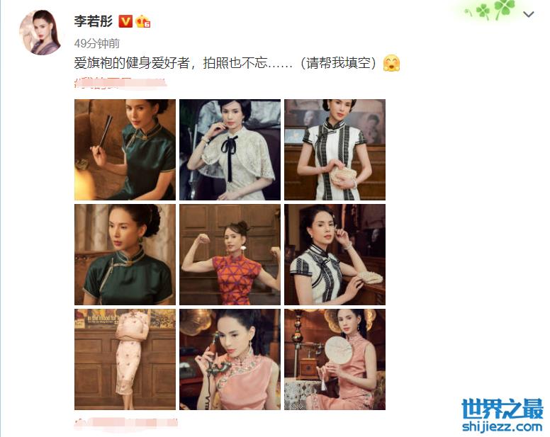8月4日,不老女神李若彤在个人社交平台上发布一组穿旗袍的美照。配文称:“爱旗袍的健身爱好者,拍照也不忘......”还请网友帮忙填空。