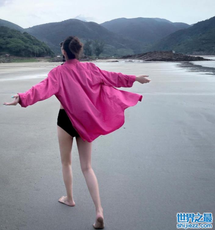 照片中,郑希怡穿着黑色的比基尼套装,外面套着一件玫红色的衬衫,一双大长腿笔直纤细像筷子一样,露出的腰腹部分平坦且没有一丝赘肉,动作自然,不管是从身材和气质上都堪比超模。