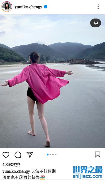 从配文中得知,郑希怡来海边玩,但是不幸遇上了小雨,这也丝毫没有影响她的好心情,在海边玩闹嬉戏、追逐奔跑,张开双臂拥抱大海,很是惬意。