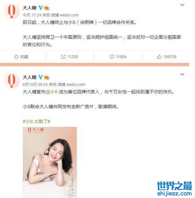 8月2日,寿全斋官方宣布终止与小S的合作:“国家利益高于一切,坚决拥护一个中国原则!寿全斋品牌即日起终止与徐熙娣女士(小S)的一切品牌合作。”