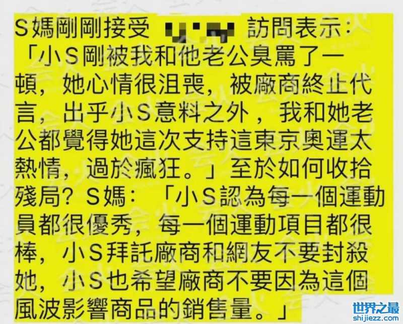 对于女儿的言行,小S的妈妈也表示:女儿刚被我和他老公臭骂了一顿,现在的她心情很沮丧,被厂商终止代言,出乎小S意料之外,我和她老公都觉得她这次支持这东京奥运太热情,过于疯狂。”