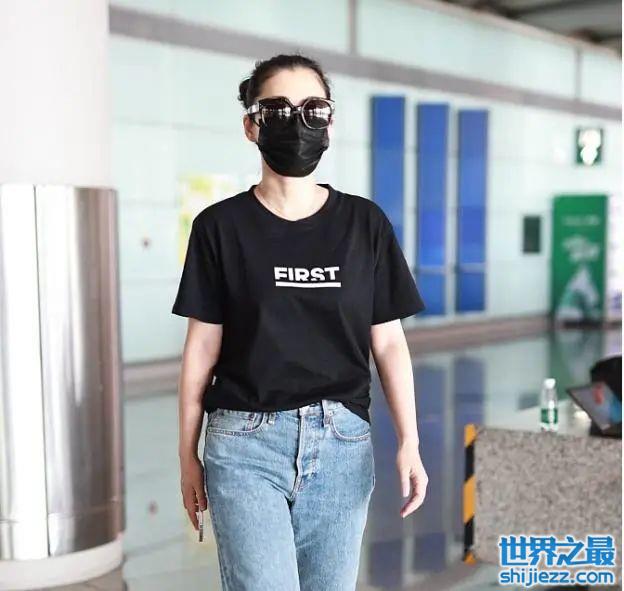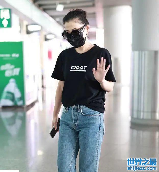 46岁梅婷素颜低调走机场,黑T恤搭配牛仔裤,挥手示意心情好 ...