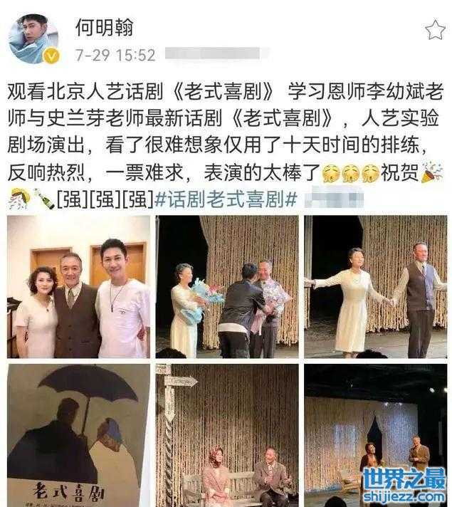 7月29日,演员何明翰发表动态称:观看北京人艺话剧《老式喜剧》 ,学习恩师李幼斌老师与史兰芽老师最新话剧《老式喜剧》,人艺实验剧场演出,看了很难想象仅用了十天时间的排练,反响热烈,一票难求,表演的太棒了!