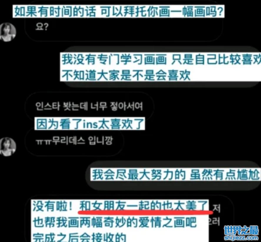 但凡权珉娥冲冲浪就不可能不知道这俩人的关系。 6月初权珉娥曾经发消息请还没确定关系的新男友帮自己画画,清清楚楚地cue到了对方的女朋友,也证明她早就知道对方不是单身。