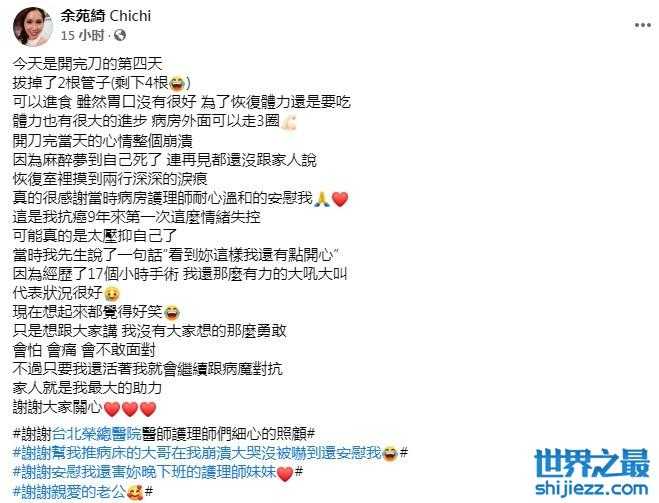 开完刀的第4天,余苑绮发文:拔掉了2根管子,还剩下4根。可以进食了,虽然胃口并没有以前好,但恢复体力还是要吃一些。体力方面已经有了很大的进步,在病房外可以走3圈了。