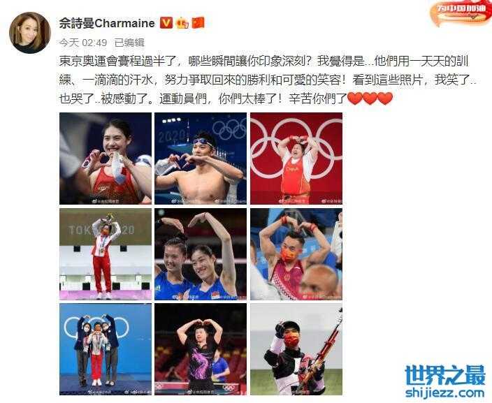 8月3日,演员佘诗曼在凌晨两点多晒出九宫格为奥运健儿打call的照片,东京奥运会赛程过半,佘诗曼晒出张雨霏,汪顺,李雯雯,杨倩等人夺冠后的比心照。佘诗曼说:“看到这些照片,我笑了,也哭了,被感动了,运动员们,你们太棒了”。