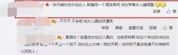 又有网友扒出了2月份的爆料:“张丹峰和他的女经纪人在酒店睡同一个房间。同时,洪欣带着女儿睡在隔壁。”