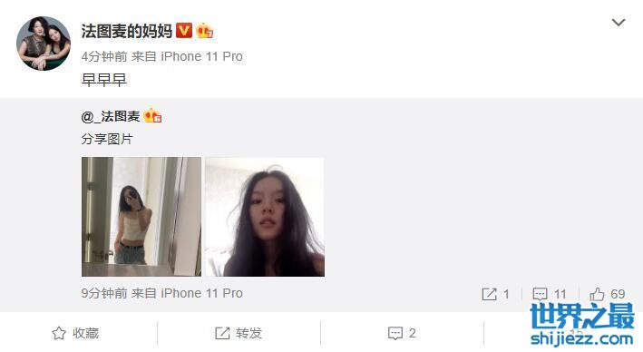 7月29日,李咏哈文19岁的女儿法图麦晒出自拍美照,上一次法图麦晒美照,还是她过19岁生日时。法图麦晒完照片后,妈妈哈文火速送去问候,评论转发:“早早早”。