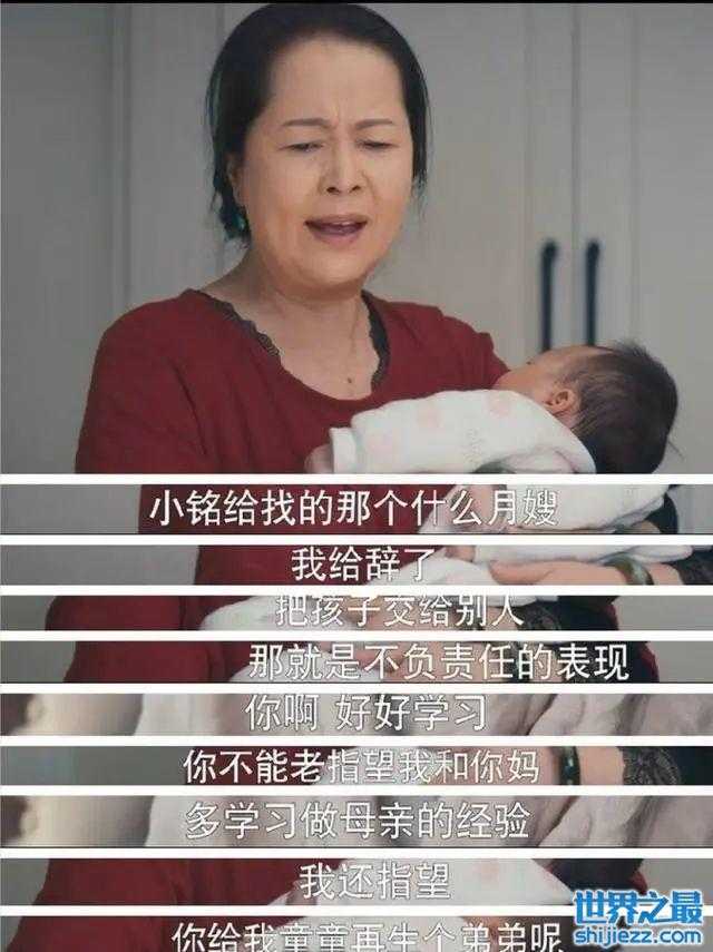 背后和杜淳饰演的儿子吐槽,表示看不上儿子给他找的这个媳妇,一胎还没出月子,就要逼着儿媳生二胎;