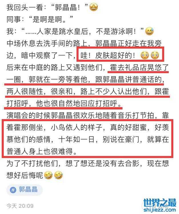 该网友描述说:“郭晶晶正好走在我旁边,暗中观察了一下,哇!皮肤超好的!后来在中庭的路上又遇到他们,霍去礼品店晃悠了一圈,郭就在一旁等着他,跟郭晶晶讲普通话的,两人很随性,很亲和,路上不少人认出他们,跟霍打招呼,他也很自然地回应打招呼”。