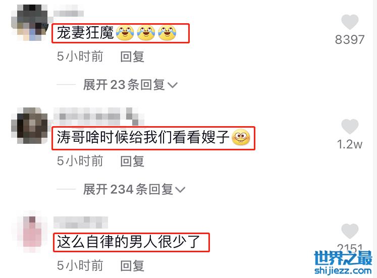 视频发出不久,网友们纷纷点赞评论,不少粉丝留言称沈涛简直就是“宠妻狂魔”,还有人不禁感叹道:“这样自律的男人很少了”。此外,还有部分网友对沈涛妻子的长相十分好奇,更是直接对他喊话要看看嫂子长什么样。