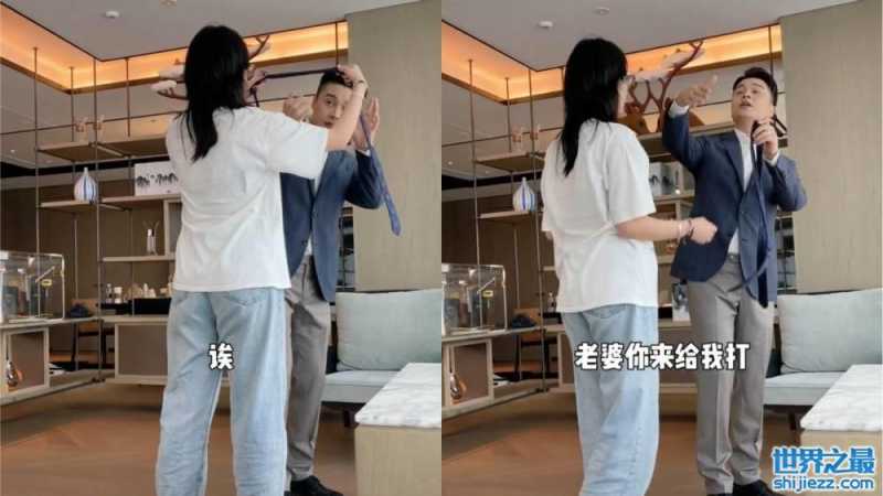 视频中,沈涛身穿西装,精致的发型和锃亮的皮鞋显得他整个人十分精神。这时,一名身穿白色上衣和牛仔裤的工作人员拿着领带正准备给沈涛系上,但沈涛却躲了过去,挥着手对镜头外的妻子说:“老婆你来给我打”。