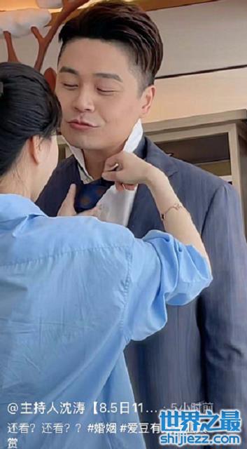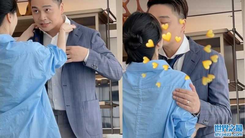 不一会,一位身穿蓝色衬衫的女子走了出来,虽然没有露脸,但不难看出她身材纤瘦皮肤白皙。从沈涛手里接过领带后,沈涛的妻子认真仔细地给他系了起来,沈涛更是笑容满面,中途时不时地与妻子俏皮互动,最后还与老婆当众拥吻,亲密相拥一脸满足。
