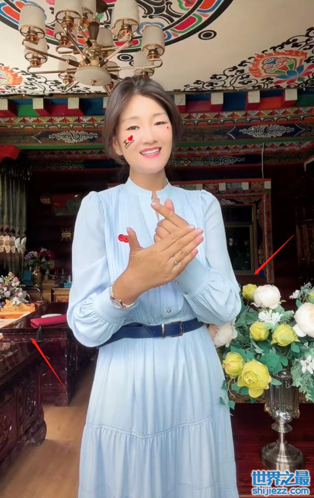 而她此前还晒过家中内景的视频。当时她身穿蓝色连衣裙,一根皮带勒出小细腰,在家中高歌。她身后摆着一个大花瓶,看起来格外的有情调,红木家具上摆放着杂物,天花板上充满着藏族彩绘的元素,低调中又不失特色。