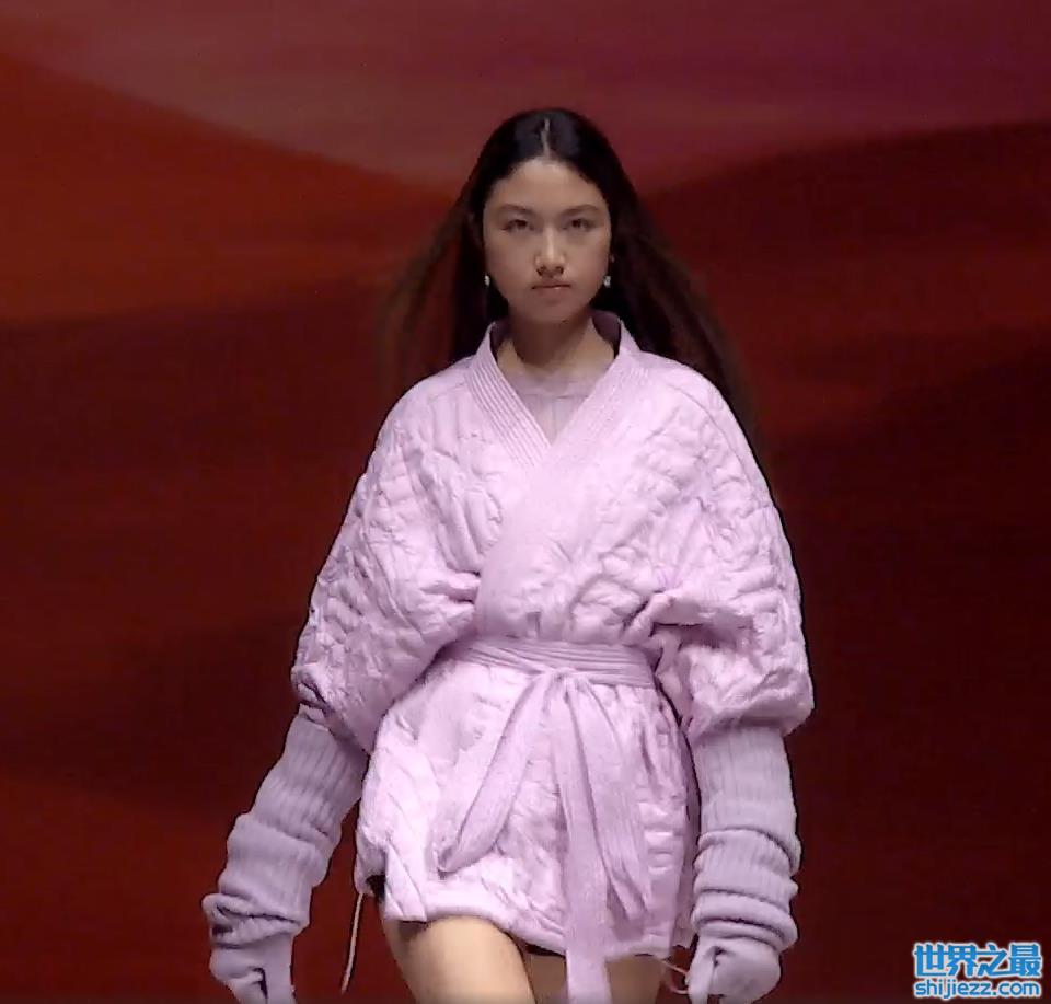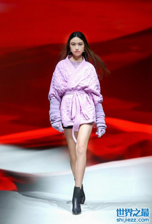 据悉,这是16岁的任晴佳的首次T台大秀。图片中的任晴佳身穿一套粉紫色连衣裙,加上腰间蝴蝶结绑带设计看起来像一件浴袍,露出的一双大长腿又白又直。