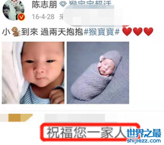 此外陈志朋在2016年在个人社交平台上分享一个动态,动态内容是两张宝宝的照片,并配文:“欢迎小猴子的到来,过两天抱抱”,在网友的认知中,觉得图片中宝宝就是陈志朋的孩子,并有网友评论:“祝福您一家”。