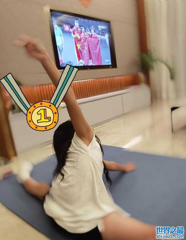 照片中,雷佳音的女儿身穿白色短袖上衣、黑色运动短裤和一双白色的袜子坐在蓝色的瑜伽垫上,电视上正放着乒乓球队夺冠的画面,她的手伸向高处摆出了一个耶的手势,头发看起来湿漉漉的,应该是刚洗完。