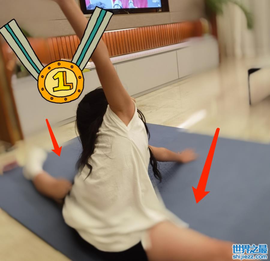 值得注意的是,小姑娘在瑜伽垫上摆出了一个标准的一字马,身体看上去非常的柔软,应该是有一定的舞蹈功底。