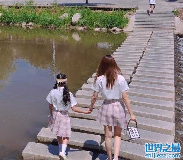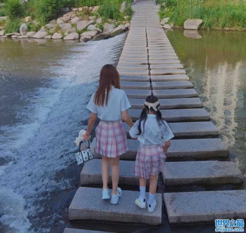 照片中,翟煦飞和她的女人两人身穿母女装,白色短袖衬衫搭配粉色格子裙还有统一的小白鞋,女儿绑着两个双马尾,头上还戴着一个发带,二人手拉着手走在一个石桥上。可以看到,才九岁的小姑娘已经长到翟煦飞的肩膀了。