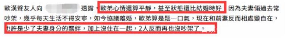 如今欧弟和郑云灿二人已经宣布离婚,双方互不打扰,重新过上了自己的生活,相信欧弟的粉丝也都希望看到他能够从离婚事件的余波中脱离出来,过上幸福美满的生活。