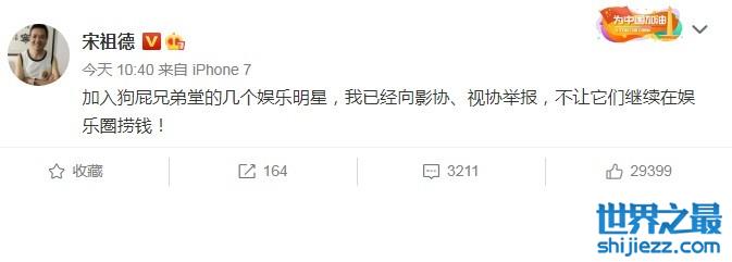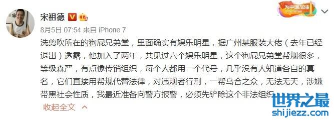 而他的最新发文,也很好地应证了这一点。大家近期一直在讨论一个关于一个什么兄弟堂的组织。正好里面也有一些明星艺人参与。于是宋祖德对此事也进行了追查。