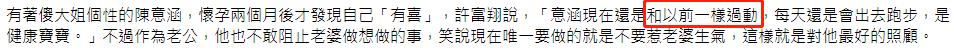 怀孕前,陈意涵就是一个十分热爱运动的人,瑜伽、游泳、爬山、骑行等样样都在行,怀孕后她也没有停下来,依旧是照常每天出去跑步。对此,陈意涵老公许富翔称他不会阻止老婆,只要她开心他就满足了。