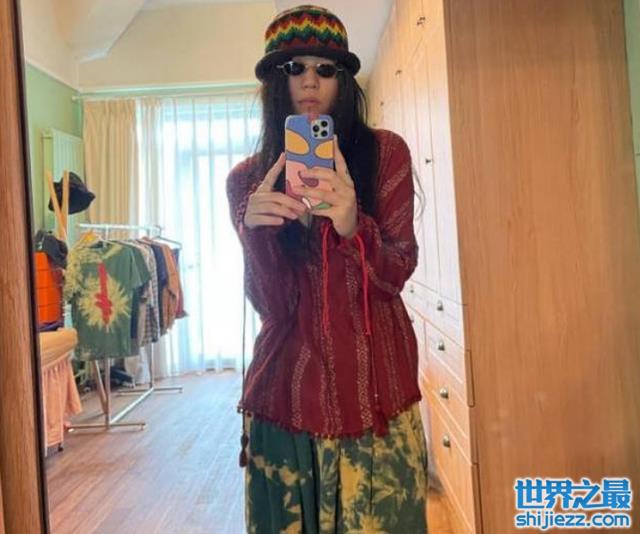 最后一张站在镜子前自拍,她发挥脑洞混搭穿着,针织彩虹帽搭配亮色花上衣花裤子,显得高冷有魅力。