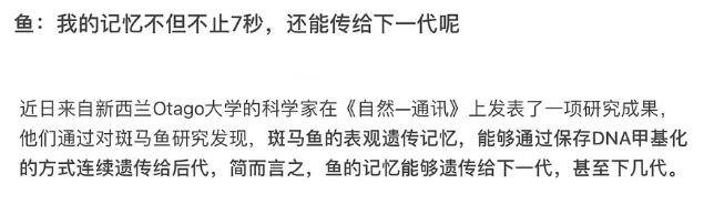 鱼被抹黑记忆力短,已经违背了生物学的最起码常识:鱼是脊椎动物,是高等动物,脑部发育还是可以的!刺激鱼几次它都能记住几个月或者几年甚至能传给下一代。