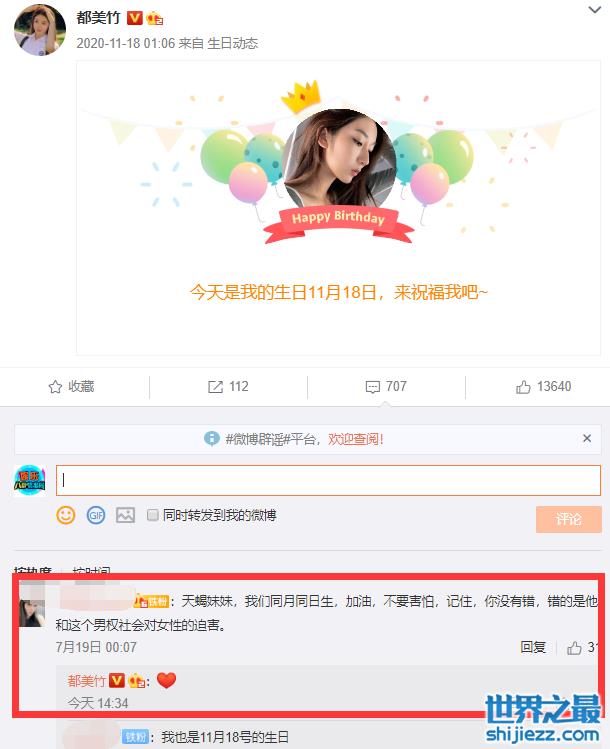 都美竹是11月18日的生日,有网友在上个月回复说:“我们同月同日生,不要害怕,你没有错,错的是他”,都美竹同样比心回应。