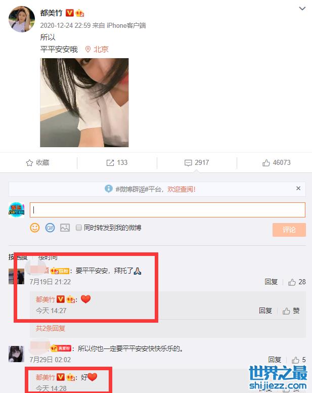 都美竹发“平平安安”的博文,铁粉也有去回复:“要平平安安,一定要平平安安快快乐乐的”,都美竹答应粉丝:“好”,并比心。